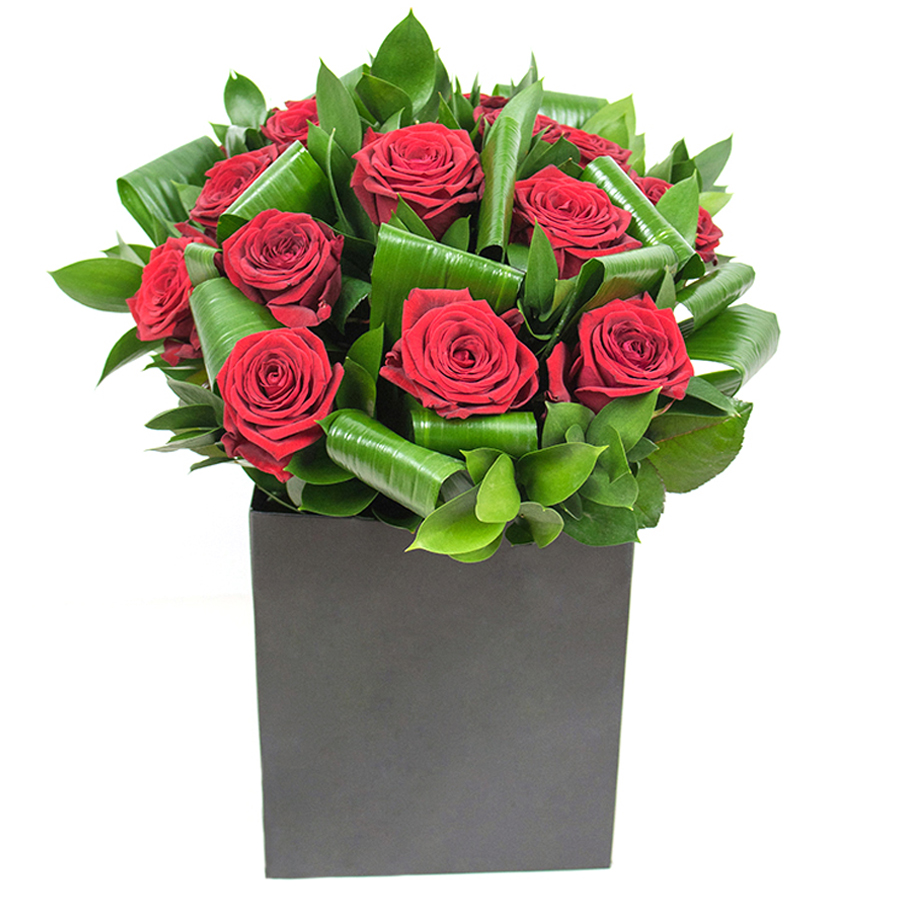 Infuse elegance into your living space with our beautiful bouquet, showcasing vibrant red roses, lush aspidistra leaves, and delicate ruscus. This unique arrangement is crafted to bring both beauty and sophistication to any environment.
