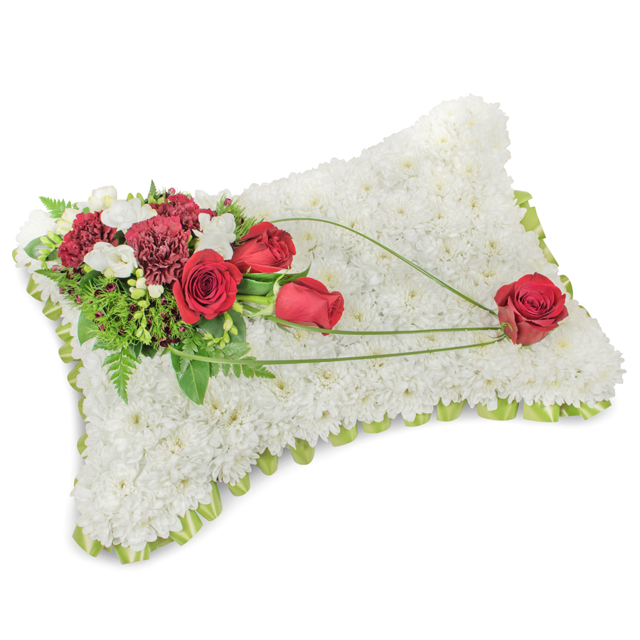 Extend your sincere condolences with our heartwarming bouquet comprising white chrysanthemums, passionate red roses, fragrant white freesias, rich dark red carnations, delicate dianthus, and bear grass.