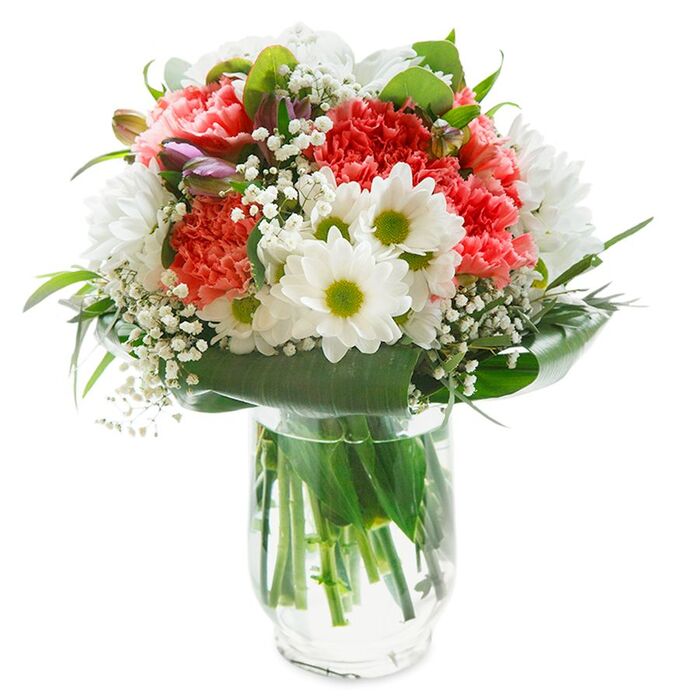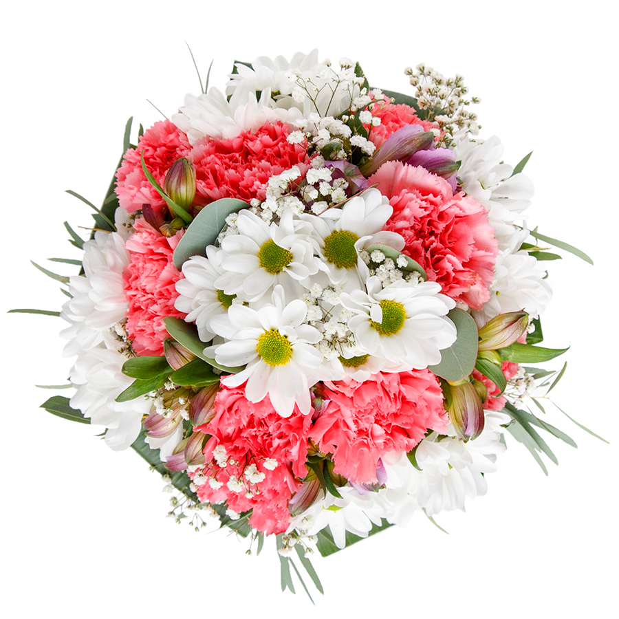 Send a message of love and care with our delicate white and pink flower bouquet. This stunning arrangement includes snow-white chrysanthemums, airy gypsophila, and light pink carnations, beautifully complemented by aspidistra leaves.